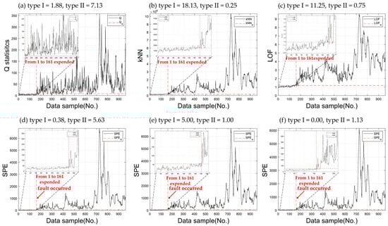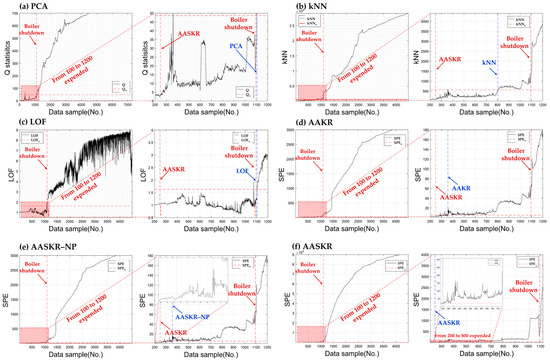 Comparison of fault detection performance between conventional and proposed methods for the TEP Fault 6 case: (a) PCA; (b) kNN; (c) LOF; (d) AAKR; (e) AASKR–NP; (f) AASKR.