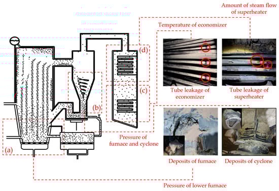 In this section, early abnormal detection times are compared to evaluating the applicability of the proposed method to a shutdown case of a CFBC boiler. CFBC is a power generation system that utilizes biomass, including methane, ethanol, and hydrogen, along with low-quality fuels like solid refuse fuel. As shown in the CFBC power generation schematic in Figure 9, the use of fluidized media and limestone improves combustion efficiency, reduces fossil fuel consumption, and lowers pollutant emissions [39]. However, the use of fluidized media, such as sand, results in the attachment of alkali salts from exhaust gases to the media and heat pipes, leading to erosion, corrosion, and agglomeration. As the flow medium passes through the rough areas of the inner surface of the pipe, faults such as deposit formation, recirculation blockage, and tube leakage may occur [40]. In the event of an actual fault, the process of identifying the cause, repairing the fault, verifying operational status, and restarting the plant takes at least one week. Therefore, a fault detection technique for CFBC based on data from the distributed control system (DCS) is essential. The generator capacity, voltage, and rotational speed of the CFBC are 9.1 MW, 6.6 kV, and 1800 RPM, respectively. Additionally, the steam turbine’s maximum capacity, maximum inlet steam pressure, and steam temperature are 72 t/h, 41 ata, and 420 °C.