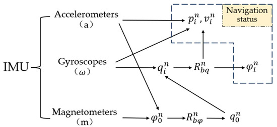 From the simplified framework diagram of the pedestrian navigation algorithm above, we can roughly understand the basic principles and steps involved in pedestrian navigation state estimation. Specifically, represents the initial attitude angle; is the rotation matrix that converts from the body frame to the navigation frame, derived from; is the initial quaternion obtained from the conversion of ; represents the new quaternion at the next time step, calculated using the gyro measurement at the current time and the quaternion ; is the rotation matrix from that converts the body frame to the navigation frame; finally, the current attitude angle can be directly computed from . Additionally, by combining the accelerometer and gyroscope measurements, along with , further calculations can provide the pedestrian’s location and velocity information at the current moment, denoted as and .