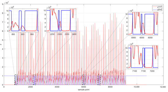 where represents the zero-velocity state of the pedestrian at each moment, obtained from Equation (5). It is an array composed of high and low levels, with being the collection of the high-level segments in . is the collection of sequence lengths of each segment. represents the range of ideal zero-velocity interval sequence sizes, and it is expressed by the following formula: