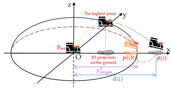 During pedestrian walking, the projection location of the foot on the ground has a maximum range value between its current moment and the previous zero-velocity moment. This value is related to factors such as the pedestrian’s height and leg length. However, due to issues like heading drift in the IMU, there may be a significant deviation between the computed location and the actual location. To suppress this error, the maximum step displacement principle can be used to constrain locations that exceed the maximum step length in each step. The model of this constraint method is shown in Figure 5.