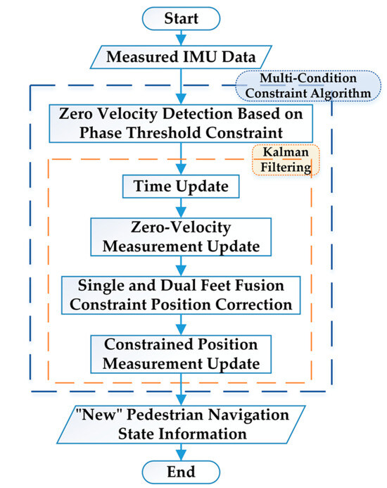 Therefore, to obtain a walking trajectory closer to the real situation, a multi-condition constraint algorithm (MCC) that combines zero-velocity interval constraints (ZC), single-foot (SC) and dual-feet fusion constraint (DC) algorithm is innovatively proposed. This method not only integrates constraint conditions to update location and velocity estimates but also effectively suppresses sensor noise and error accumulation, thereby constructing a complete pedestrian navigation system. Figure 7 illustrates the simplified framework of this system.