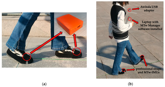 IMU-mounted and use method. (a) Foot Enlargement Diagram. (b) Snapshot of the Walking Process.