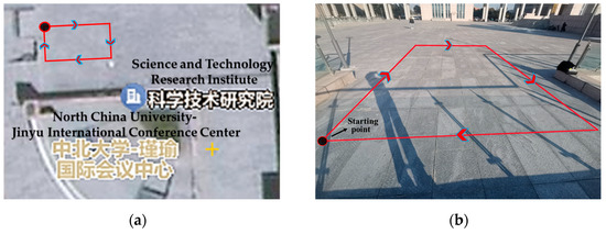 The experimental field was chosen on the flat open ground in front of the Institute of Science and Technology at North University of China. The experimental path is a rectangular closed loop with a length of 9.03 m, a width of 4.825 m, and a total perimeter of 27.71 m, as shown in Figure 10.