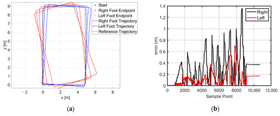 The experimenter is a healthy adult female with a height of 160 cm and a weight of 50 kg. Based on the relationship between the experimenter’s body conditions and stride length, the ideal single-step length for the experimenter is approximately 1.3 m. Therefore, in this experiment, the single-step length threshold for the single and dual-feet fusion constraint algorithm is set to , and the parallel distance between the two feet is set to d = 10 cm. Based on Formula 10, the ideal dual-feet distance threshold is calculated to be approximately . In addition, during the walking experiment, the participant completed three laps around the experimental path, resulting in a total walking distance of approximately 83.13 m.