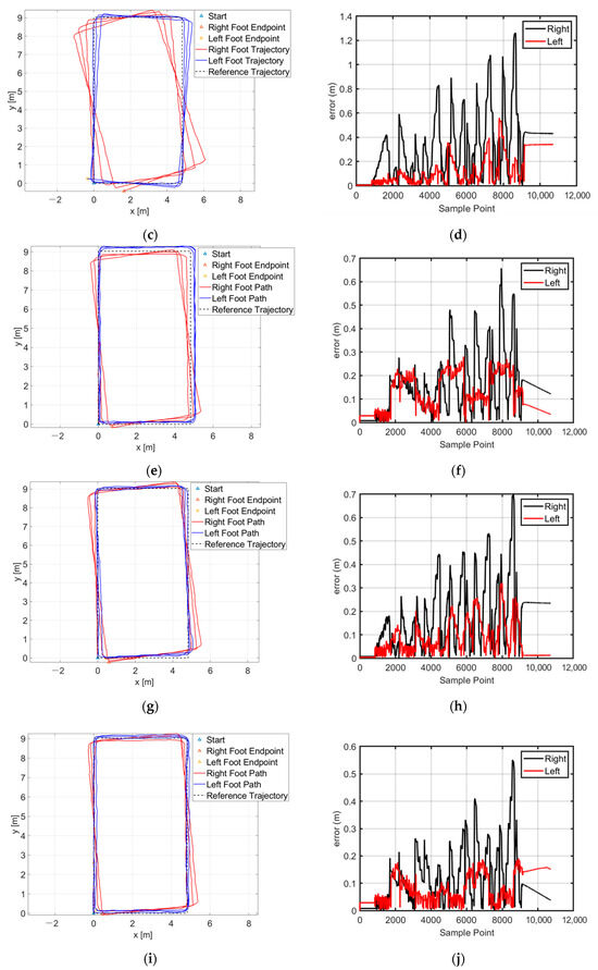 Experimental trajectory with five different algorithms. (a) Traditional ZUPT algorithm. (b) Point-wise error values by the traditional ZUPT algorithm. (c) ZC algorithm. (d) Point-wise error values by the ZC algorithm. (e) ZC-SC algorithm. (f) Point-wise error values by the ZC-SC algorithm. (g) ZC-DC algorithm. (h) Point-wise error values by the ZC-DC algorithm (i) MCC algorithm. (j) Point-wise error values by the MCC algorithm.