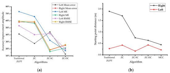 By comparing and analyzing the error results of different algorithms, the accuracy improvement achieved by the proposed MCC algorithm in three different error types is shown in Figure 12a. The maximum improvement in accuracy reaches 73%, while the minimum is 13%. In addition, Figure 12b shows the starting–end point distances of the trajectories obtained by each algorithm. Through comparative analysis, it can be observed that the MCC algorithm also exhibits a significant improvement in the convergence of the trajectory endpoints.