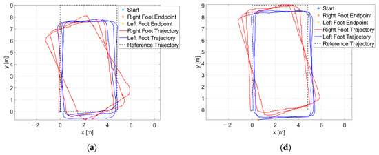 By comparing and analyzing the results of multiple algorithms mentioned above, a deeper understanding of the characteristics and functions of different algorithms can be obtained. For example, by comparing Figure 11c,e, it is evident that the single-foot constraint has a significant correction effect, especially in suppressing long-term heading divergence and closing point convergence of a single IMU. However, the single-foot constraint fails to effectively maintain the consistency of the dual-feet trajectory, leading to a noticeable discrepancy with the actual walking trajectory. Further comparison of Figure 11e,g shows that the dual-feet constraint outperforms the single-foot constraint in maintaining the consistency of the dual-feet trajectories. However, in terms of heading calibration for multi-loop trajectories, the dual-feet constraint algorithm is slightly inferior to the single-foot constraint. Although the dual-feet constraint algorithm can bring the trajectories of the two feet closer together, it may, to some extent, affect the stability of the heading. Therefore, combining the single-foot and dual-feet constraints can complement each other’s weaknesses. In the integrated algorithm, both their advantages and disadvantages are harmonized. Furthermore, this approach does not require additional auxiliary equipment, achieving a more optimal overall result. Overall, the multi-condition constraint algorithm demonstrates superior performance in both adaptability and stability.