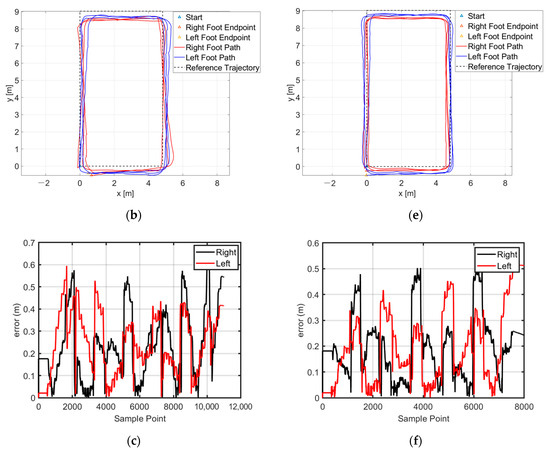 The experimental results in Figure 11 represent the data collected under normal walking conditions of the test subject. To verify the effectiveness of the MCC algorithm proposed in this article under different walking speeds, slow and fast walking experiments were conducted along the same experimental path. The results from these experiments are shown in Figure 13. Since the sampling frequency of the IMU sensor used in the experiments remained constant, the number of sampling points along the same path reflects the walking speed of the subject. As shown in Figure 13a, during slow walking, the trajectory of using the traditional ZUPT algorithm exhibits significant errors. This is due to the high rate of false detection of zero-velocity intervals in the traditional ZUPT algorithm at slow walking speeds. However, the trajectory by using the MCC algorithm (Figure 13b) significantly corrects these deviations, and the results are very close to the reference trajectory, with a substantial reduction in errors. The experimental results under fast walking conditions follow the same pattern, as can be seen by comparing the results in Figure 13d,e. In conclusion, the MCC algorithm proposed in this article is able to maintain high correction performance across varying walking speeds, demonstrating its strong robustness.