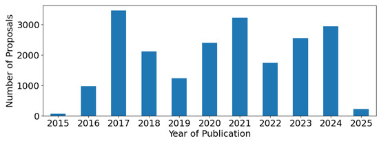 The dataset consists of 20,923 proposals from Join and 454 from iVoting, submitted between 2015 and 2025. The earliest recorded entry on Join dates back to 10 September 2015, while the latest entry was submitted on 7 January 2025. In contrast, the earliest available proposal on iVoting dates back to 13 April 2017, while the latest one in our dataset was submitted on 22 June 2022. The number of proposals on Join from 2015 to 2025 can be seen in Figure 1; the number of proposals on iVoting from 2015 to 2022 are declining, as shown in Figure 2. iVoting has become obsolete at this point. For each proposal, the dataset includes information such as the title, content, submission date, proposer’s username, background, rationale, and vote count. Personal identifiers like gender, age, and real names were optional for submission and are not included in the dataset. Given the low volume and government-initiated nature of certain iVoting proposals—such as the Shezidao case—direct comparisons between the platforms present challenges.