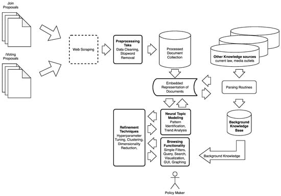 Our proposed method for analyzing e-participation platforms involves a multi-stage process designed to extract, preprocess, and analyze citizen proposals from platforms such as Join and iVoting and is based on [21], as shown in Figure 3. Initially, data are collected via web scraping, extracting proposals submitted by users on these platforms. The raw text undergoes a series of preprocessing tasks, including data cleaning and stopword removal, resulting in a collection of processed documents. These documents are then transformed into embedded representations, which serve as inputs to our neural topic modeling framework. This model identifies patterns, themes, and trends within the proposals, providing a structured understanding of the topics discussed.