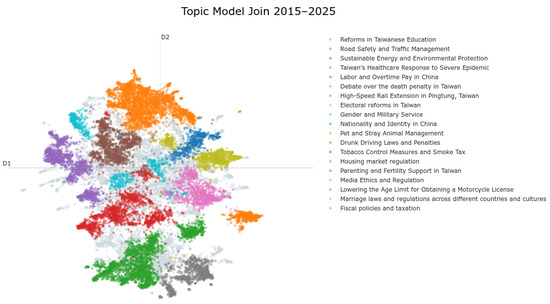 The topic model of the Join platform can be seen in Figure 4. The resulting clusters reveal dominant themes in public discourse, highlighting major areas of concern and policy engagement over the years. The visualization in Figure 4 presents a scatter plot of the clustered topics, while Table 1 provides the corresponding topic distribution. The clustering results show that Government Policies and Regulations form the most significant category, which is the noise cluster, since all proposals fall in this category. Education Policies in Taiwan and Traffic Safety Regulations also emerge as major areas of discussion, indicating public interest in transportation safety and educational reforms. Other notable themes include Energy Transition and Sustainable Development, Labor Rights and Regulations, and Electoral Reform, highlighting concerns related to governance, sustainability, and social policies. To complement the Join platform’s topic clusters, we analyzed discussions within the iVoting platform. The results demonstrate a parallel focus on governance, sustainability, and specific policy issues, with Governance and Sustainability in Taiwan, Taipei Public Transport Infrastructure, and Traffic Management being dominant themes.