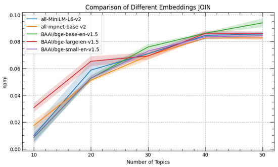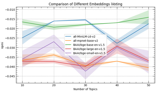 Figure 6 illustrates the comparison of different embeddings on the iVoting platform in terms of NPMI. The results indicate that the all-MiniLM-L6-v2 embedding consistently outperformed other models across varying topic counts, with the highest NPMI values observed at lower topic counts. Conversely, embeddings from the models published by the Beijing Academy of Artificial Intelligence (BAAI)—BAAI/bge-large-en-v1.5 and BAAI/bge-small-en-v1.5—exhibited lower NPMI scores, particularly as the number of topics increased. This suggests that these models may be less effective at capturing the underlying semantic structure. The shaded areas around the curves represent the confidence intervals, highlighting the stability of the different models across multiple trials.