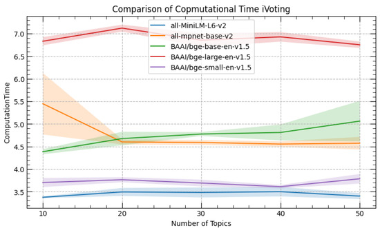 In terms of computational efficiency, Figure 7 displays the average computation time required for each embedding model on the iVoting platform. The results reveal that the BAAI/bge-base-en-v1.5 and BAAI/bge-small-en-v1.5 embeddings maintained relatively low computation times, ranging between 4 and 5 s, regardless of the number of topics. In contrast, the all-MiniLM-L6-v2 embedding showed increased computation times, particularly at higher topic counts, although it remained below 7 s. This suggests a trade-off between embedding performance and computational efficiency.