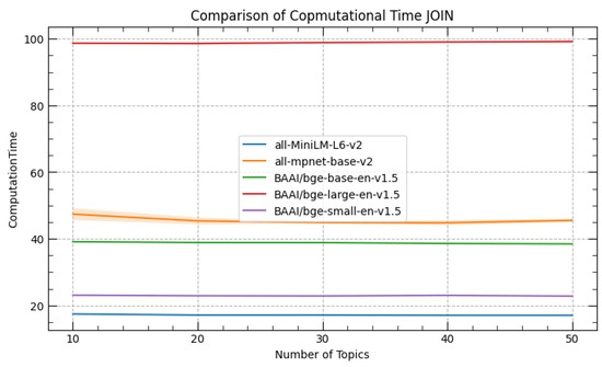 Figure 9 displays the computational time required by different embedding models for topic modeling on the JOIN platform, plotted against the number of topics. The models under comparison include all-MiniLM-L6-v2, all-mpnet-base-v2, BAAI/bge-base-en-v1.5, BAAI/bge-large-en-v1.5, and BAAI/bge-small-en-v1.5. In contrast to the iVoting dataset, the BAAI/bge-large-en-v1.5 model takes the longest computational time consistently across all topic numbers, exceeding 100 s. The BAAI/bge-base-en-v1.5 follows at a stable computational time of approximately 40 s, while BAAI/bge-small-en-v1.5 performs significantly better in terms of computational efficiency, taking less than 20 s. The all-mpnet-base-v2 model starts around 60 s for 10 topics and gradually decreases to about 55 s with an increasing number of topics, showing some efficiency improvements with larger topic numbers. The all-MiniLM-L6-v2 model, while relatively stable, sits close to the performance of BAAI/bge-small-en-v1.5, maintaining a time between 15 and 20 s.