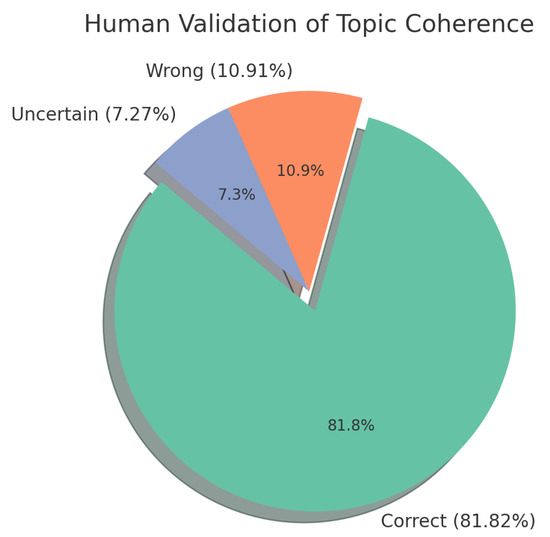 To further assess the correctness of the extracted topics, a human validation experiment was conducted with domain experts. A total of 110 topics were reviewed, and each was categorized as either correct, incorrect, or uncertain. The results indicate that 81.82% of the topics were deemed correct, 10.91% were identified as incorrect, and 7.27% fell into the uncertain category, as shown in Figure 10.