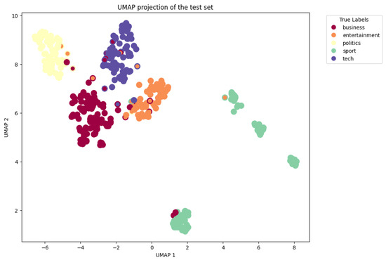 The results were visualized using a UMAP projection of the test-set embeddings, as shown in Figure 11. The scatter plot highlights the true and predicted labels, providing insights into the model’s ability to separate the classes in the embedding space. Misclassified samples were also analyzed to identify potential limitations of the model. Some documents belonging to overlapping topics (e.g., business and politics) were harder to accurately classify. Additionally, a confusion matrix was visualized in order to show the models performance Figure 12.