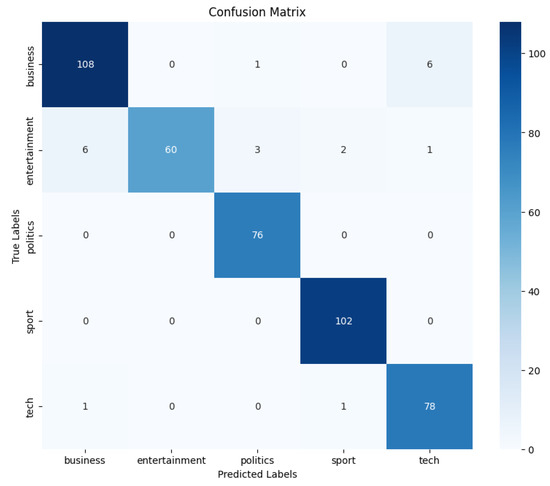Further, the effectiveness of the topic-modeling pipeline was evaluated using the BBC dataset [29], which consists of documents labeled into five thematic groups: business, entertainment, politics, sport, and tech. The dataset consists of 2225 articles. The labels were encoded using LabelEncoder from the scikit-learn library, and the dataset was split into training and testing sets with an 80-20 ratio.