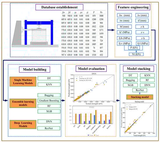 The RCSW shear capacity prediction model is established using the procedure depicted in Figure 1. First, collect the test data from the existing literature and establish the corresponding database; in the second step, analyze the distribution characteristics of each input parameter and the correlation with the target parameter; in the third step, randomly split the dataset into two parts, 80% for training and 20% for testing, and train single, ensemble, and deep learning models; in the fourth step, examine each model’s prediction accuracy and compare with the theoretical model; in the fifth step, stack each model to establish a stacked model that combines the characteristics of each model and evaluate the model; and in the sixth step, the trained models are stacked to build a stacking model and then evaluate the model.