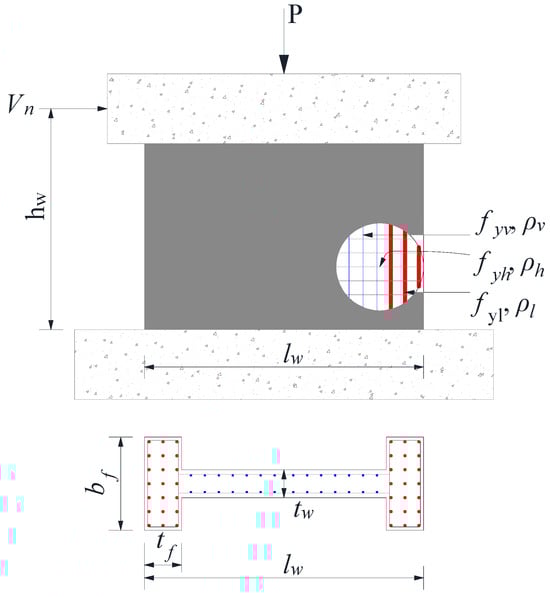 Compared with thin beams as well as deep beams, the shear mechanism of RCSWs is relatively complex, mainly due to the fact that RCSWs experience axial forces and the height-to-width ratios of the sections are large. At present, many scholars examine the RCSWs’ shear performance through low-week repeated loading tests, as shown in Figure 2, where P is the axial load for the simulation of the vertical load borne by the wall, Vn is the horizontal load for the simulation of the horizontal load of the wall caused by the earthquake, which are used to obtain the value of Vn, that is, the walls’ seismic shear-bearing capacity. In the figure, hw is the height of the wall, lw is the height of the wall section, tw is the thickness of the unconfined zone of the wall panel, bf and tf are the width and length of the side columns or the edge confining members of the wall, respectively, and fyh (ρh), fyv (ρv), and fyl (ρl) are the yield strengths of longitudinal reinforcement of the side columns, the vertical distributing tendons, and the horizontal distributing tendons, respectively (the reinforcement ratio).