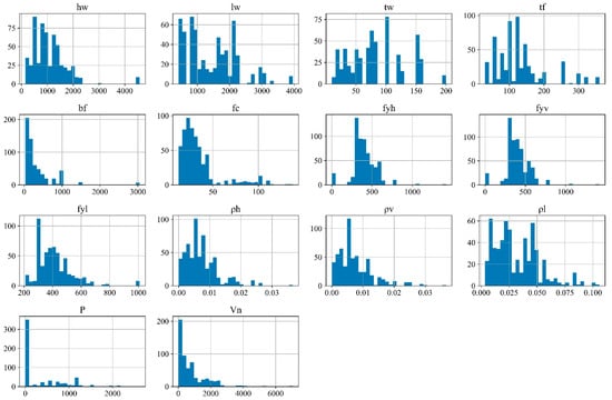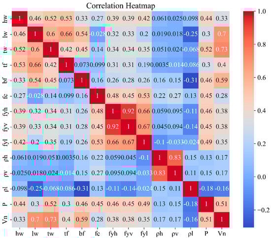 Figure 4 shows the graph of the Pearson’s correlation coefficient of each parameter. The correlation coefficients of each parameter, with the shear strength of the wall range from −0.16 to 0.73, and each parameter has a certain influence on the RCSWs’ shear-bearing capacity. Among them, the wall size parameters, including wall height, section height and width, and the length and height of side column section, have a bigger impact on its ability to withstand shear, and their correlation coefficients are 0.33, 0.7, 0.73, 0.4, and 0.59, respectively, in which the horizontal and vertical reinforcements have a more obvious influence, but the longitudinal reinforcement rate of side columns shows a negative correlation. The correlation coefficient between the axial force of the RCSW and its shear capacity is 0.51, which indicates that the axial load cannot be disregarded when determining the RCSWs’ shear capacity.