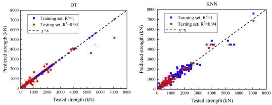 The shear capacity prediction model for RCSWs is constructed using the two ML models, DT and RF. To enhance the model’s generalization performance and prediction accuracy, hyperparameters are tailored to the models’ input parameters. The hyperparameters of DT and RF ML models are optimized by a grid search and their performance is evaluated on a test set. The grid search traverses a predefined dictionary of models and performs a grid search for each model to debug its hyperparameters. Negative Mean Square Error (MSE) is computed through 5-fold cross-validation, and the best model is used to predict the test set and compute the MSE, which helps to select the best-performing model. Table 2 summarizes the optimal values of hyperparameters for DT and RF; for DT, the optimal values are a maximum depth of 10, a minimum number of leaf samples of 1, and a minimum number of division samples of 5, which helps to prevent overfitting. For KNN, the optimal number of neighbors is 7, the weights are distance-weighted, and the metric is chosen as the Manhattan distance.
