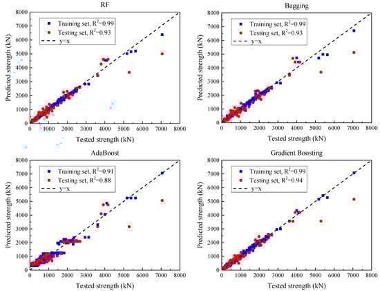 The ensemble ML models of RF, Bagging, AdaBoost, and Gradient Boosting are used to establish the shear capacity prediction of the RCSW, and the hyperparameters of each model are optimized by a grid search, and the optimized parameter values are shown in Table 4. For RF, the optimized hyperparameters include the number of trees (n_estimators, optimally 100), the maximum depth (max_depth, optimally 30), the minimum number of samples required for node splitting (min_samples_split, optimally 2), and the minimum number of samples in the leaf nodes (min_samples_leaf (optimally 1). The hyperparameters of the Bagging method, on the other hand, include the number of base learners (n_estimators, optimally 10), the percentage of samples per base learner (max_samples, optimally 0.7), and the percentage of features (max_features, optimally 1). The main hyperparameters of the AdaBoost model are the number of base learners (n_estimators, optimally 100) and the learning rate (learning_rate, optimally 0.1). In the Gradient Boosting model, the hyperparameters include the number of base learners (n_estimators, optimally 50), the learning rate (learning_rate, optimally 0.2), the maximum depth (max_depth, optimally 3), and the sample share (subsample, optimally 0.8).