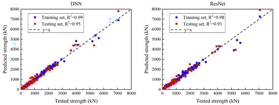 The deep learning models DNN and ResNet are used to establish the shear strength prediction model of RCSW, the hyperparameters are optimized by calling the ‘tuner.search’ method, the training set is used for training, and the optimized parameter values are shown in Table 6. For the DNN model, the optimal number of layers is four, which takes into account the model complexity and training difficulty. The units’ number in each layer is 256, 256, 96, and 32, showing that the first two layers can effectively capture complex features, while the gradual reduction in the number of units in the subsequent layers is in line with the principle of layer-by-layer abstraction in deep learning. In addition, the first and third layers use the ReLU activation function, while the second and fourth layers use the Sigmoid and ReLU, respectively, demonstrating effective modeling of nonlinear relationships. The optimizer is chosen to be Adam, which is recognized for its superiority in handling sparse data and convergence speed. For the ResNet model, the optimal number of units in the initial fully connected layer is 128, and five residual blocks are set up, aiming to increase the model complexity and alleviate the gradient vanishing problem through the residual learning mechanism. The number of units in each residual block is 192, which moderately guarantees the representation capability. The learning rate is chosen to be 0.00245, which shows satisfactory convergence speed and stability.