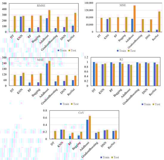Based on the prediction performance metrics in Figure 7 and Table 7, DNN has an RMSE of 85.4 on the training set and 263 on the test set, showing its lower prediction error on the training set. In contrast, ResNet has an RMSE of 111.7 on the training set and 335.7 on the test set, and although both have higher errors on the test set, DNN still has a lower test error, indicating that it is more capable of generalization. DNN has an MSE of 7287.6 on the training set and 69,173.2 on the test set, while ResNet has an MSE of 12,466.9 on the training set and 112,717.9 on the test set, which further proves that DNN fits better than ResNet on the training set, and performs relatively well on the test set, showing a better generalization ability. The MAE of DNN is 50.7 and 112.7 on the training set and test set, respectively, compared to ResNet’s MAE of 59.7 and 107.7, indicating that DNN is more advantageous in terms of stability and accuracy. In addition, the R2 of DNN is 0.99 for the training set and 0.95 for the test set, showing a very high degree of fit, whereas the R2 values of ResNet are 0.98 and 0.91, which is not a bad performance, but a slightly better fit for DNN. Finally, in terms of CoV, DNN has CoVs of 0.244 and 0.26 for the training and test sets, respectively, compared to ResNet’s 0.226 and 0.238; although they are relatively close to each other and DNN’s CoV for the test set is slightly higher, the ResNet shows a slightly weaker consistency in generalization performance. Overall, DNN outperforms ResNet in all metrics, especially in the key metrics of RMSE, MSE, and MAE, reflecting lower prediction error and higher goodness-of-fit and showing higher reliability and accuracy.