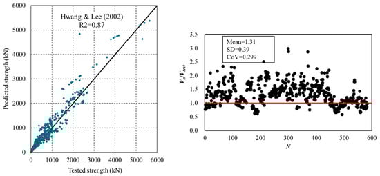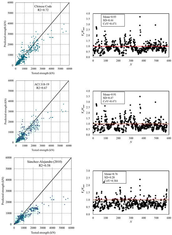 The predicted values of the shear capacity for each RCSW, based on the above models, are obtained, and the comparison with the test values is shown in Figure 9, with the distribution of the predicted-to-test value ratio for each wall specimen. Table 8 summarizes the predicted performance values of each model, as well as the mean, standard value, and CoV of the expected ratios of test values.