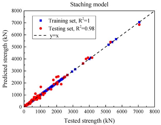From the above study, it is found that the ML models demonstrate excellent prediction accuracy in predicting the shear-bearing capacity of RCSWs, but each of the above ML models has different prediction accuracies for different data characteristics in the dataset and there is still room for improvement in the CoV of the predicted-to-experimental ratios; for this reason, the stacking approach is employed to combine the various ML models into a stacking learning method to better improve the prediction accuracy and reliability. First the RCSW shear-bearing capacity database (Section 3), and then, several different types of ML models (Section 5), including single, ensemble, and deep learning models, are combined, and each model is trained using a training set, which together build the first layer of the stack. Next, the predictions of each base model are applied to the training set and the validation (or test) set to obtain the predictions. Subsequently, the predictions of all base models are combined into a new feature set, with each column representing the output of a base model. Next, the selected model (LinearRegression) is used as the second layer model and is trained using the feature set and corresponding actual labels generated in the previous step. In the testing phase, the test set is then first predicted using all base models to generate a new feature set, and it is subsequently fed into the trained meta-model to produce the final prediction. Figure 10 shows the predicted values of each specimen obtained by the stacking model in contrast to the test values.