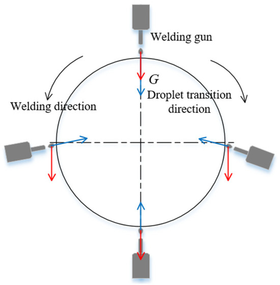 The migration process droplets from the tip of the welding wire to the molten pool is referred to as droplet transfer. The droplet transfer behavior plays a crucial role in determining spatter, arc stability, and molten pool behavior, which directly impacts the stability of the welding process and the quality of the weld seam [3,4]. In GMAW, there are three primary modes of droplet transfer: short-circuit transfer mode, globular transfer mode, and spray transfer mode [5]. Short-circuit transfer typically occurs at lower welding currents, where the molten droplet contacts the workpiece through the arc gap, forming a short circuit. This mode features low heat input and is suitable for thin plate welding. Globular transfer can be further divided into coarse droplet and fine droplet transfer. When the current is relatively small and the arc voltage is high, coarse droplet transfer forms, with the droplet diameter being larger than the wire diameter [6], resulting in significant spatter. Conversely, when the current is higher, fine droplet transfer occurs, characterized by minimal spatter and a stable arc, making it widely used in production. Spray transfer mode features high arc power, concentrated heat flow, strong penetration capability, and good weld bead formation quality. For pulsed gas metal arc welding (P-GMAW), there are three typical droplet transfer modes: one droplet multiple pulses (ODMP), one droplet per pulse (ODPP), and multiple droplets per pulse (MDPP). ODPP is considered the ideal droplet transfer mode by many scholars [7,8]. Regardless of the welding form, if the droplet transfer is unstable, the weld seam is prone to defects such as porosity, slag inclusion, or poor fusion. For all-position welding, the effect of gravity on droplet transfer varies with different welding positions: in the flat welding position, gravity acts as a promoting force for droplet transfer, whereas in the overhead welding position, gravity acts as a hindering force, as shown in Figure 1. A stable droplet transfer process can be obtained by optimizing the process parameters, which in turn ensures the high-quality of weld formation.