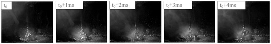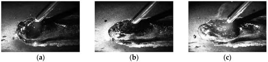 Under the same welding wire diameter, the wire feeding speed (WFS) determines the magnitude of the welding current, and thus the impact of WFS on droplet transfer reflects the influence of welding current on droplet transfer. Dongqing Y et al. [12] observed the droplet transfer modes in GMAW at different wire feeding speeds. They found that when the WFS was between 3 and 8 m/min and the arc voltage was moderate, the droplet transfer was in a stable short-circuit transfer mode (as shown in Figure 2), leading to good weld seam formation; as the WFS increased, the droplet transfer became unstable, with more spatter; when the WFS exceeded 10 m/min, the droplet transfer mode shifted to spray transfer (as shown in Figure 3), resulting in poorer weld seam formation. Liu Wenji et al. [7] analyzed the impact of WFS on droplet transfer at the overhead welding position. They found that increasing the WFS helps to obtain smaller droplets and a higher transfer frequency, making it easier for droplets to reach the molten pool. However, under the effect of gravity, the molten pool struggles to flow towards the sides, easily forming a raised weld seam in the middle, which increases the amount of post-weld grinding work.