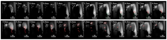 Droplet transport behavior of the right wall when the welding torch oscillated with 4.6 mm (The red circles indicates the droplet). Reprinted with permission from Ref. [13]. Copyright 2023, Authors.