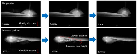 Gravity is a critical factor influencing the formation of all-position welds. Park J H et al. [26] used the P-GMAW process to weld in flat, vertical-down, and overhead positions, analyzing the behavior of the molten pool under the influence of gravity in different positions. As shown in Figure 7, during vertical-down welding, the molten pool flows downward due to gravity, accumulating at the center of the arc, which shortens the distance between the wire tip and the molten pool. When the droplet contacts the molten pool surface, short-circuiting transitions are likely to occur, leading to arc instability and spatter. In the overhead welding position, the combination of gravity and reverse flow causes the tail of the molten pool to experience strong reverse flow, leading to more molten metal accumulating at the tail of the molten pool (as shown in Figure 8). This increases the weld height and results in a weld shape with a central bulge. To mitigate the issue of molten pool flow, Cai X Y et al. [27,28] studied the behavior of the molten pool in the overhead welding position under the influence of gravity, based on all-position tandem narrow-gap GMAW. Most molten metal flows backward due to gravity, resulting in less molten metal beneath the arc. By adjusting the wire feed speed, they achieved high-quality welds suitable for the overhead welding position. Compared to laser welding, laser–arc hybrid welding offers higher robustness against welding defects but also results in greater weld penetration and wider weld beads [29]. Han R et al. [30] introduced a copper backing in laser–GMAW hybrid welding, which can accelerate the cooling and solidification process of the molten pool, particularly in vertical-up and overhead welding positions, thereby reducing the risk of molten pool downward flow.