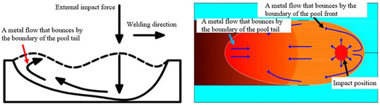 Huang J et al. [31] revealed the effect of the current waveform on the solidification process of the molten pool during P-GMAW welding and investigated the dynamic behavioral characteristics of the molten pool (shown in Figure 9). The front of the molten pool is compressed, forcing the molten metal to flow towards the rear of the molten pool due to the obstruction at the bottom. Upon reaching the boundary at the rear, the molten metal is reflected. Meanwhile, the metal flow on the front surface of the molten pool is driven backward under the combined effects of impact force and surface tension, converging with the other stream of molten metal at the rear of the molten pool, leading to the accumulation of molten metal. Wang L et al. [32] utilized high-speed photography and tracer particle technology to anlyze the characteristics of molten metal recirculation under different welding speeds and magnetic field excitation currents. Based on their findings, they proposed methods to suppress the formation of raised weld humping. Zhu C and colleagues [33] also investigated the effect of oscillating arcs on the behavior of the molten pool. An oscillating arc brings more heat to the side walls, causing the molten pool to oscillate with a large amplitude. This facilitates the rise of bubbles and helps reduce the formation of incomplete fusion defects.