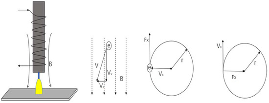 Guan Z Q et al. [49] generated a longitudinal magnetic field parallel to the welding torch axis using a magnetic generator installed on the welding torch. Under the influence of the Lorentz force FX and the magnetic field B, charged particles in the arc undergo rotation (as shown in Figure 11), causing the arc to rotate at high speed, which increases the heated area and thereby controls the flow of the molten pool. Similarly, applying a transverse magnetic field uses the Lorentz force to deflect the arc, thereby changing the heat distribution on both sides of the groove and enhancing the quality of the weld seam formation [50]. To achieve sufficient sidewall fusion without significantly increasing the heat input, Wang J et al. [51] found that by applying an alternating magnetic field to assist arc welding, an alternating magnetic field can be formed in the arc burning zone, periodically deflecting the welding arc within the pulse current cycle, which can provide more arc heat. However, the effectiveness of this method relies on precise adjustment of magnetic field parameters, which can be challenging to achieve in actual operation. Jian X et al. [52] established a mathematical computational model for narrow-gap tungsten inert gas welding to study the behavior of the welding arc and molten pool under the influence of an alternating longitudinal magnetic field. This research enhances the understanding of how external magnetic fields can be effectively utilized to control the welding process and improve weld seam quality. However, the model does not fully take into account the various complex conditions and interactions among variables that may occur during actual welding processes. Most existing studies focus on the impact of a single variable (such as magnetic field strength or frequency) on the welding process while neglecting the interactions among multiple factors and their overall effect on the welding outcome. For example, Yu J et al. [53] successfully achieved the joining of low-carbon steel Q235B using plasma-enhanced pulsed GMAW with an external magnetic field. Their research found that as the magnetic field current increased, the coupling of the dual arcs also increased. However, when the magnetic field current exceeded 1A, the changes in arc shape tended to level off. Changing the frequency of the applied alternating magnetic field can alter the shape of the welding arc, reducing the spatter rate and improving the appearance of the weld seam. Guan Z Q et al. [49] analyzed the effect of magnetic field frequency on GMAW arcs using high-speed camera techniques. Their analysis revealed that the shape and movement of the arc change with variations in the external magnetic field frequency. Below 60 Hz, the arc shape expands, leading to a deterioration in the weld bead appearance and mechanical properties. Conversely, above 60 Hz, the weld bead appearance and mechanical properties are significantly improved.