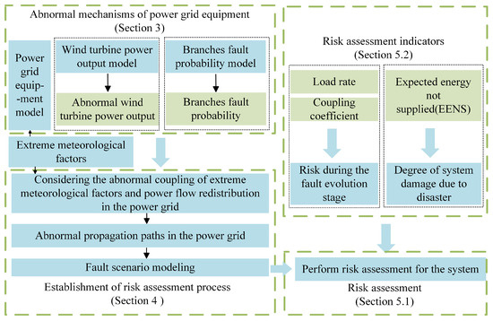 As tropical cyclones pass, the extreme meteorological factors affecting power grid equipment and the equipment’s abnormal states evolve continuously. Traditional fault chains, which previously considered only overloads and power flow risk factors, have evolved to account for the coupling of time-varying extreme weather conditions and power flow risks [22]. To address this, we propose a risk assessment method that incorporates the spatiotemporal evolution of grid anomalies during tropical cyclones. First, the impact mechanisms of tropical cyclones on grid equipment, including transmission lines and wind power, are analyzed to identify the time-varying abnormal states of grid equipment during cyclone events. Second, the evolution patterns of system anomalies under the coupling and interaction of time-varying extreme weather factors and power flow risks are examined. Third, alternating simulations of equipment failures induced by extreme weather and power flow redistributions are conducted based on the coupling mechanism, leading to the development of methods for constructing fault chains and scenario sets during tropical cyclones. Finally, the overall system risk assessment results are presented, incorporating uncertainties in extreme weather factors and grid parameters associated with tropical cyclones.