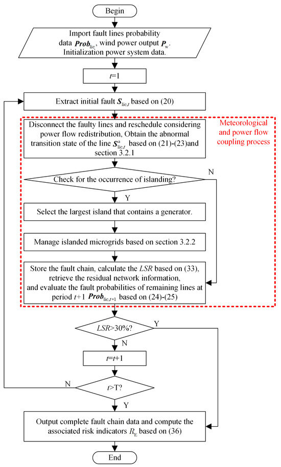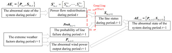 From Equations (20)–(25), it is evident that the system transitions from abnormal state to state , influenced not only by extreme meteorological factors at period t + 1 but also by the transition state of the branches caused by power flow redistribution at period t. The alternating coupling of extreme meteorological factors and power flow redistribution drives the system’s abnormal evolution. The coupling process of grid anomalies, considering extreme meteorological factors and power flow redistribution, can be summarized as shown in Figure 2: