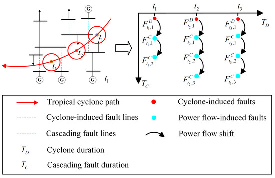 Based on Equations (20)–(25) in Section 4.1, the transition of grid abnormal states from one period to the next is a complex process governed by both power flow redistribution and extreme meteorological factors. During the T periods of a tropical cyclone, each period corresponds to a unique system state distribution, forming the abnormal propagation path illustrated in Figure 3. The fault events caused by extreme weather factors at longer time scales (minutes or hours) are denoted as in Figure 3, with representing the development time of extreme weather. At shorter time scales (seconds or milliseconds), cascading overload faults due to power flow redistribution are denoted as in Figure 3, with representing the development time of cascading faults. The radial derivatives in Figure 3 represent the power flow transfer process that occurs when an initial branch failure leads to a redistribution of system power flow. If this redistribution results in line overloads, the radial arrows illustrate the flow shift, while the blue dots indicate lines that disconnect due to these overloads.