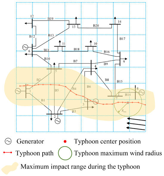 In this case study, the tropical cyclone event is validated by simulating the path of Typhoon Maria, the eighth typhoon of 2018 in China. The typhoon’s path data are mapped onto the grid topology, yielding the modified IEEE 14 system topology, with the typhoon path annotated as shown in Figure 5. In this case study, the maximum wind speed of the wind radius (with radius ) is defined as the risk wind zone based on the critical wind speed for plastic fatigue damage. The transmission towers are constructed using Q345 material, with a unit distance of 5 km between two towers. All wind farms use the same model of wind turbine, the American NREL 5MW wind turbine. The cut-in, rated, and cut-out wind speeds of the turbine are as follows: m/s, m/s, and m/s. The specific parameters of the wind turbines, towers, and transmission lines are provided in Table 1.