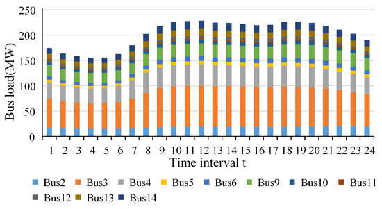 The IEEE 14 system represents a portion of the U.S. power system (located in the Midwest), including 14 buses and 20 transmission lines. In this system, the generators at nodes 2, 3, and 8 are replaced with wind farms, each with an installed capacity of 40 MW and equipped with 8 NREL 5 MW wind turbines. The load data at various time points during the passage of the typhoon are shown in Figure 6.