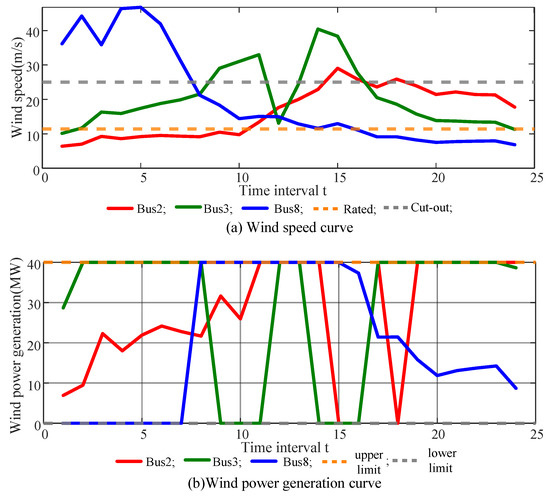 Figure 7 illustrates the following trends in wind power output at bus 2: during , the output slowly increases as the typhoon approaches; during , as the wind farm nears and exits the risk wind circle, wind speed rises rapidly, resulting in fluctuations at high speeds that cause frequent start-stop operations and abnormal ramping of turbines; during , as the typhoon moves away, the wind speed decreases gradually from to , maintaining rated power output. The wind farms at buses 3 and 8 are impacted by the typhoon earlier than at bus 2, showing a similar wind power development trend but with an “advance” phenomenon.