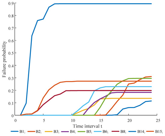 The time-varying fault probabilities of the branches are illustrated in Figure 8. As shown in Figure 5, the branches affected by the typhoon risk circle include branches 1–6, 8, 14, and 15. Branches 8, 14, and 15 are the first to be impacted by the typhoon, being close to the wind circle’s edge. In the period , these branches experience high wind speeds, causing a sharp increase in cumulative fatigue damage, which results in fault probabilities of 0.1971, 0.8937, and 0.2699, respectively. In the interval , as the typhoon moves away, the cumulative fatigue damage no longer increases, and the fault probabilities for branches 8, 14, and 15 stabilize. Compared to branch 14, branches 1–6 are further inland, where the typhoon’s intensity has decreased, resulting in lower wind speeds and, consequently, lower cumulative fatigue damage, leading to reduced fault probabilities. The remaining branches are far from the typhoon and outside the risk wind circle, resulting in a fault probability of 0.