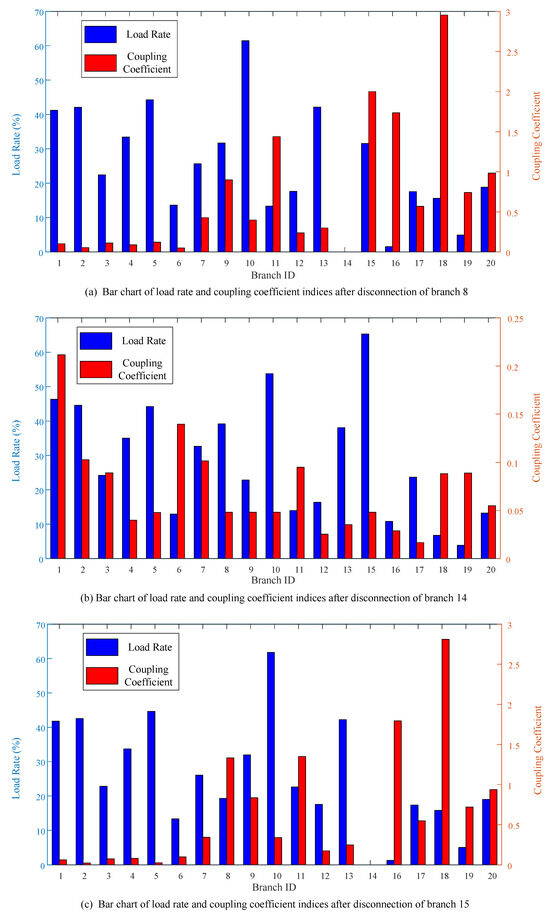 To explore the evolutionary characteristics of the system during failures, this study provides a detailed analysis of the flow and meteorological coupling effects for various branch disconnections. Observing the changes in load rates and coupling coefficients following branch disconnections allows for a better understanding of flow distribution characteristics under fault conditions and the interactions between branches. The following analysis details the system’s response to disconnections of various branches, revealing key features in the fault evolution process. The high-risk fault branches under typhoon conditions are disconnected in sequence: branch 14 at period 3, branch 15 at period 4, and branch 8 at period 5, leading to the changes in load rates and coupling coefficients after disconnection as illustrated in Figure 9. Observing the changes in load rate indicators and coupling coefficients of other branches facilitates the preliminary assessment of the fault chain’s evolution trend.