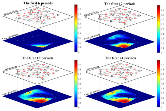 As the fault evolves, the fault probabilities of the lines caused by extreme weather and power flow redistribution are shown in Figure 10. The color bar and numbers on the right side of the Figure 10 indicate the total fault probability associated with the fault evolution stages caused by extreme weather and cascading failures. The red ’B’ followed by a number represents the branches in the system. Beginning at the 6th period, meteorological factors led to a gradual increase in fault probabilities for several branches. By the 12th period, the affected area within the system had significantly expanded, particularly for branches 9, 12, and 14, which exhibited fault probabilities exceeding 0.7. This indicates an intensifying impact of the typhoon on critical regions of the power grid, resulting in substantial flow transfers along these branches. During the 18th and 24th periods, the distribution of faults within the system intensified further, highlighting the increasing exposure of the power grid’s vulnerabilities due to the typhoon’s continued impact.
