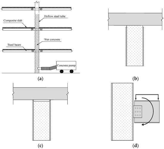 CFST columns during construction: (a) Concrete-filled steel tubes during building construction []; (b) Preloading on the concrete core; (c) Preloading on the steel tube; (d) Preloading on the side of the steel tube [].
