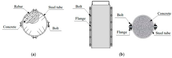 CFST with an active preload: (a) Radial preload using rebar and bolts []; (b) Radial preload using flanges and bolts [].