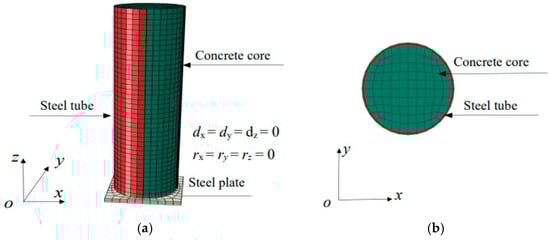 Finite element model of a CFST column. (a) Elevation view; (b) Cross-sectional view.
