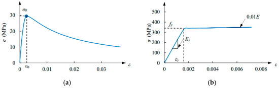 In Equation (1), the peak stress is expressed by . The peak strain is described by , where εc0 is the peak strain of plain concrete (.